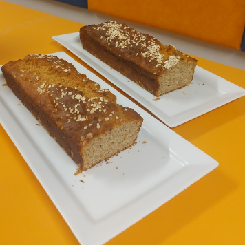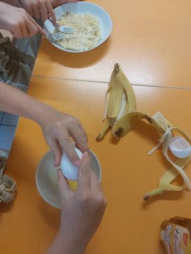 - Mehl mit Haferflocken und Backpulver vermengen und zu den Bananen geben
